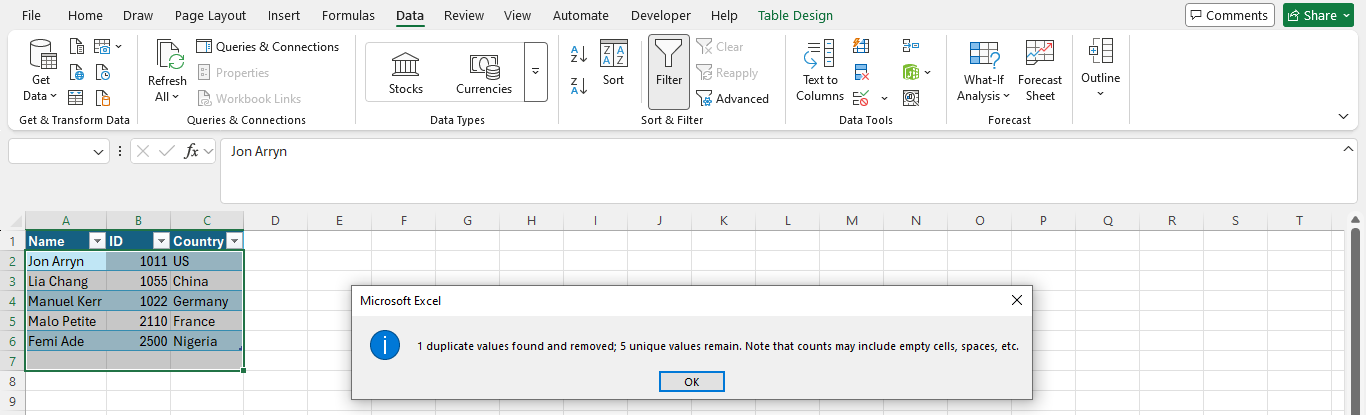 - Click OK. This prevents Excel from deleting two different people who happen to share the same name.