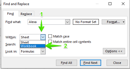 If you don’t know where information is stored, set the Find and Replace scope to the entire workbook. This allows Microsoft Excel to search across all sheets and jump directly to the specific cell containing your result.