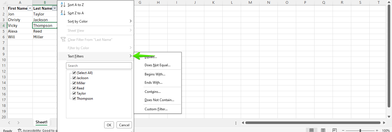 For more complex operations, you can access "Text Filters" from the dropdown. This allows you to search for: