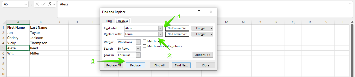 Click Replace to change one at a time, or Replace All to update the entire workbook instantly.